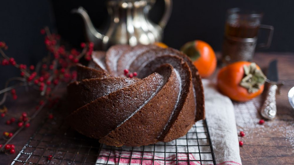 Snowy winter day, hot tea, roaring fire, sweet nutty spicy persimmon cake...