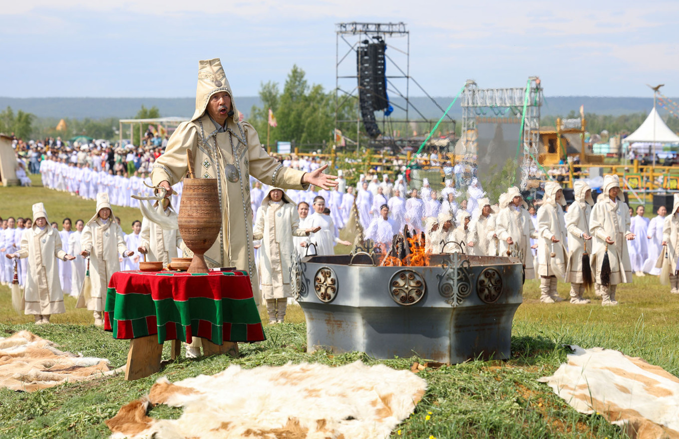 Yhyаkh traditionally centers around the ritual that involves feeding the fire with a horse milk drink and asking the spirits to bless all the people gathered at the celebration.