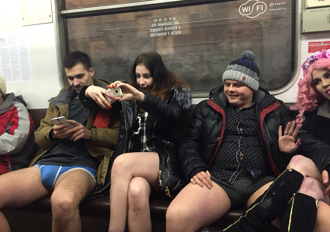 Subway riders in Moscow take part in the “No Pants Subway Ride” on Jan. 10, 2016. The stunt was based on a flash mob launched by an improv group in New York City.