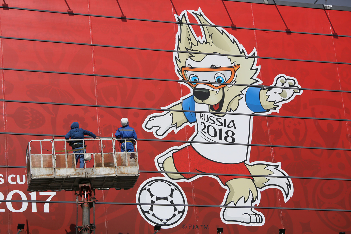 A banner to promote the 2017 FIFA Confederations Cup featuring Zabivaka, the official mascot of the 2018 FIFA World Cup in Russia, hangs in the train station at Moscow’s Sheremetyevo Airport. Zabivaka was chosen as the mascot in October 2016.