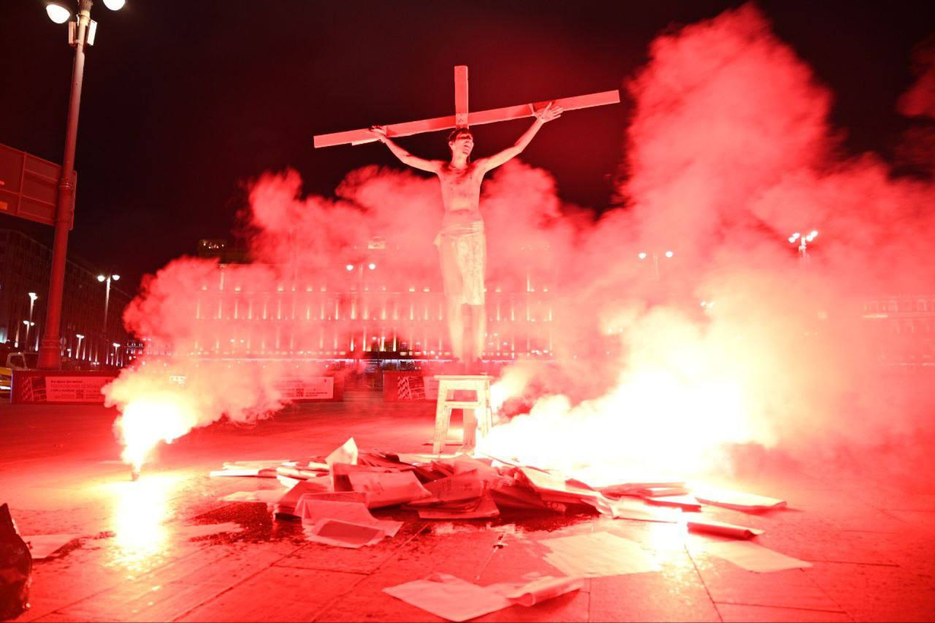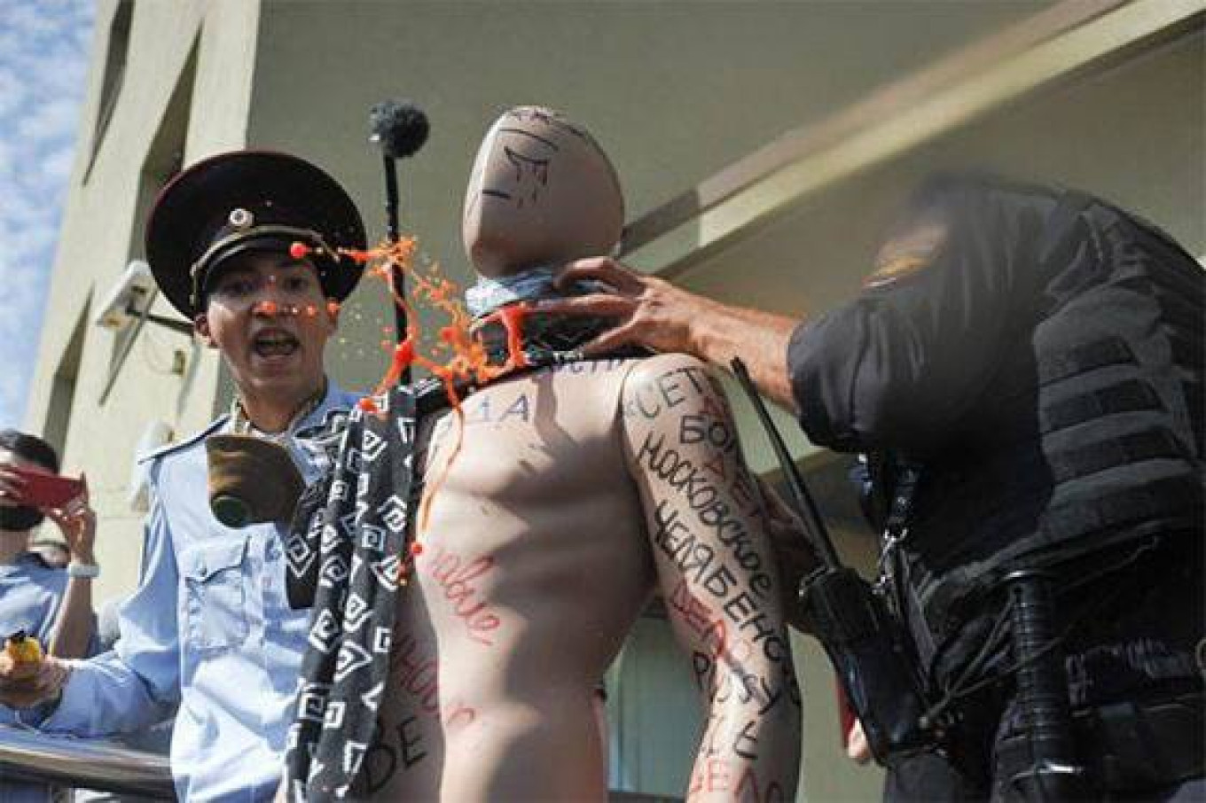 Pavel Krisevich once handcuffed himself to the fence of the Russian district court and sat dressed as a prisoner trapped in a ball made of barbed wire. He once cut a mannequin with a knife while dressed as a police officer, posed as Jesus on the cross around burning piles of papers in front of the FSB headquarters on Lubyanka. Using an unloaded gun, he staged a pretend suicide attempt at the heart of Russia’s totalitarian state — Moscow’s Red Square.