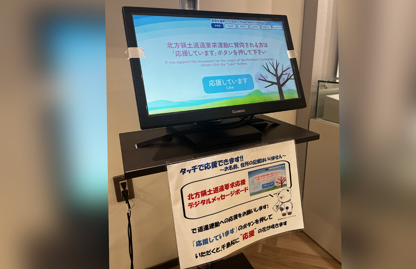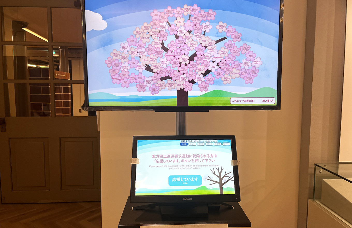In one corner, a table is filled with forms where visitors are encouraged to write letters pledging their “support for the return of the Northern Territories.”