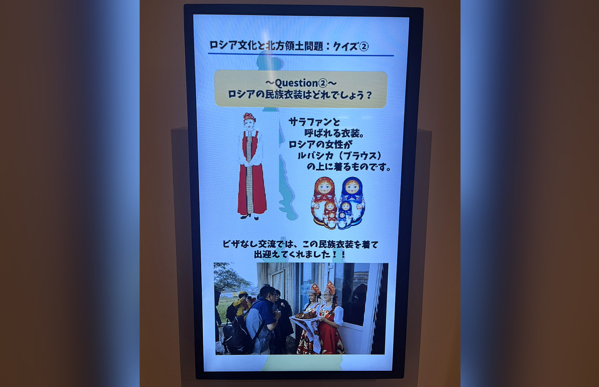 Nearby, a virtual quiz tests visitors on their knowledge of Russian culture, asking them to identify traditional Russian outfits and distinguish them from other European folk dress.