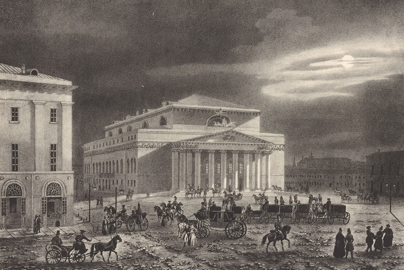 A moonlit view of the Bolshoi and surrounding buildings in 1830.