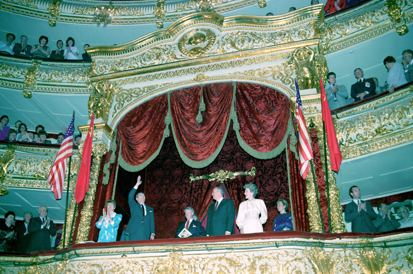 U.S. President Ronald Reagan, First Lady Nancy Reagan, Soviet leader Mikhail Gorbachev and First Lady Raisa Gorbacheva visit the Bolshoi in 1988.