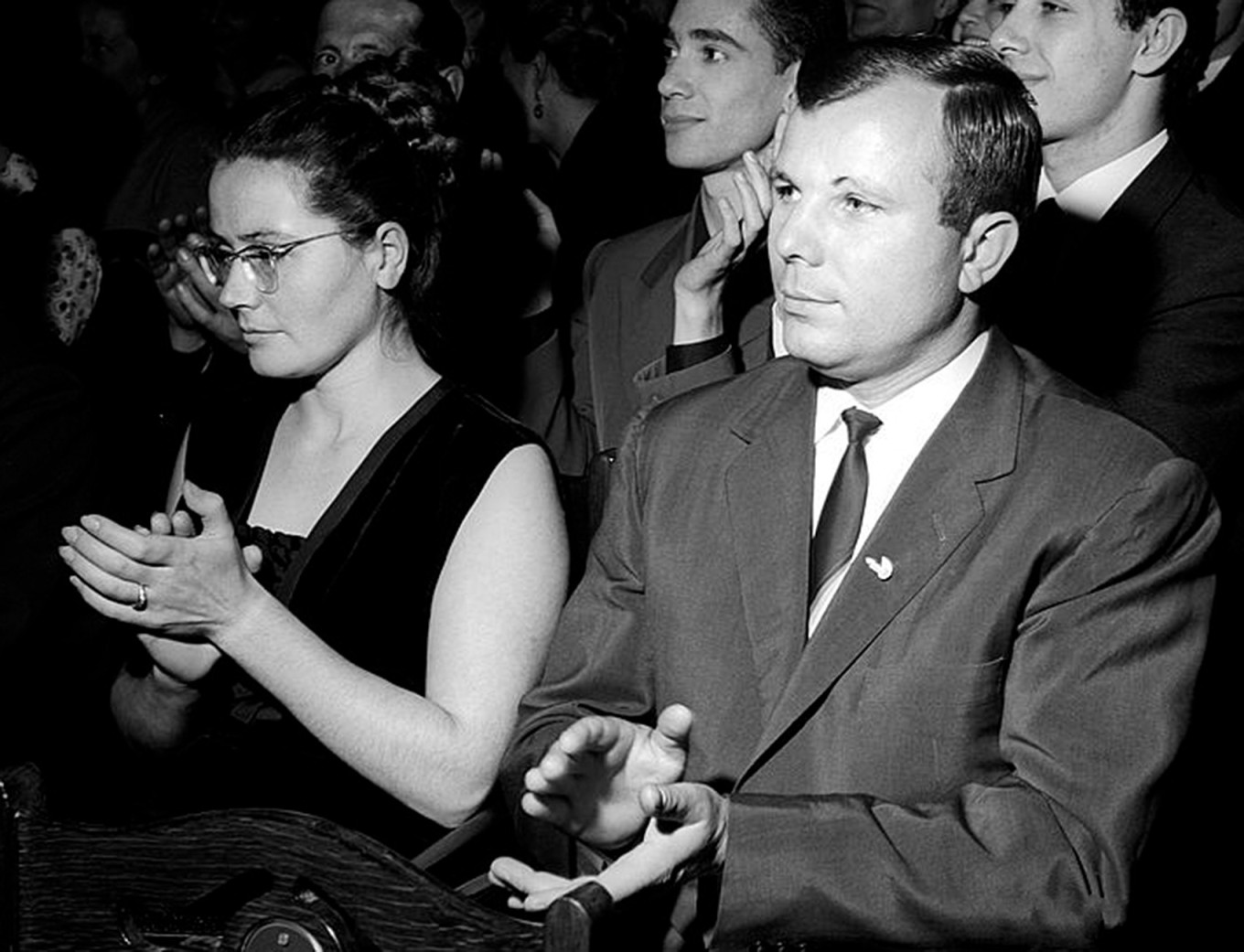 Yuri Gagarin and his wife Valentina Goryacheva applaud the Company of the Teatro alla Scala after its performance of the opera "Turandot" at the Bolshoi Theatre in 1964.