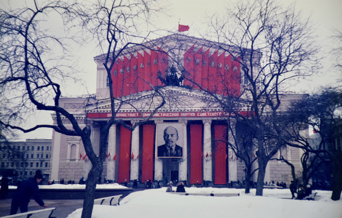 A portrait of Vladimir Lenin hands from the facade of the Bolshoi in 1986.