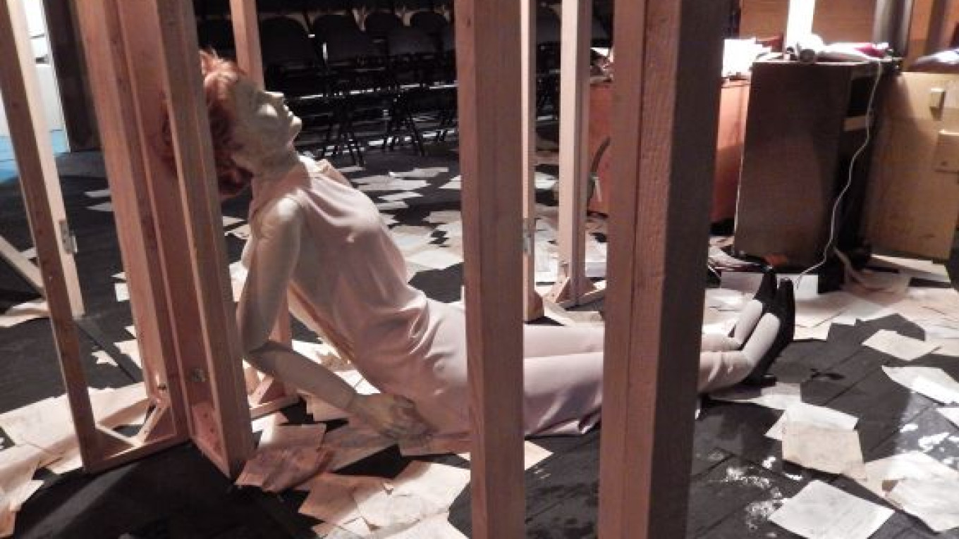 To say this production is performed on the Small Stage of the Chekhov Moscow Art Theater is only to provide information that will get you to the right place once you have a ticket in hand. In fact, it takes place in four discrete cubicles, each seating 40 spectators, who, for most of the performance, are isolated from one another by cardboard walls. We occasionally hear unseen spectators laughing or murmuring, thus letting us know something is happening even though we don't know what it is.