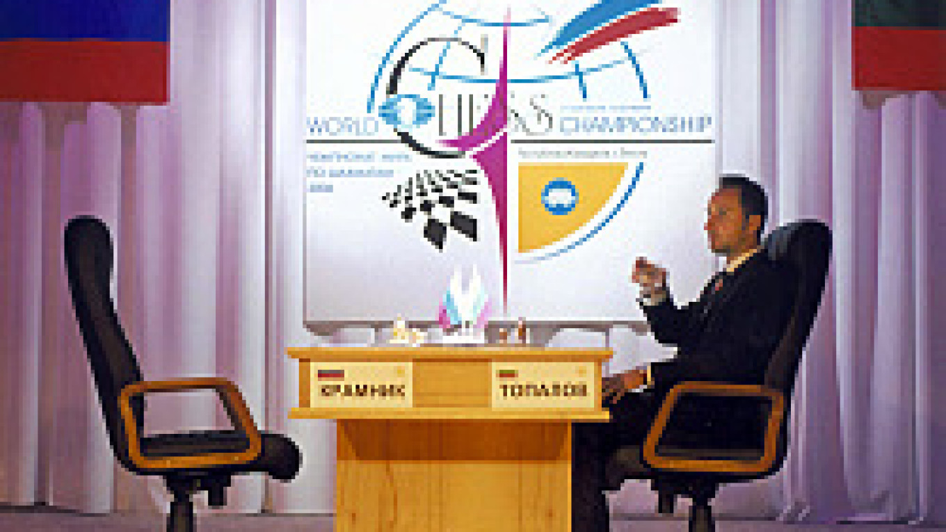 In response to the bathroom ban, Kramnik spent game time Friday lounging in his private room adjacent to the off-limits bathroom. Topalov waited at the chessboard for the Russian to show up.