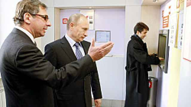 ![]() Alexei Nikolsky / Ria-Novosti Aven, seen with Putin at an Alfa Bank branch in Novosibirsk in October, sees the stabilization fund as a success. | |