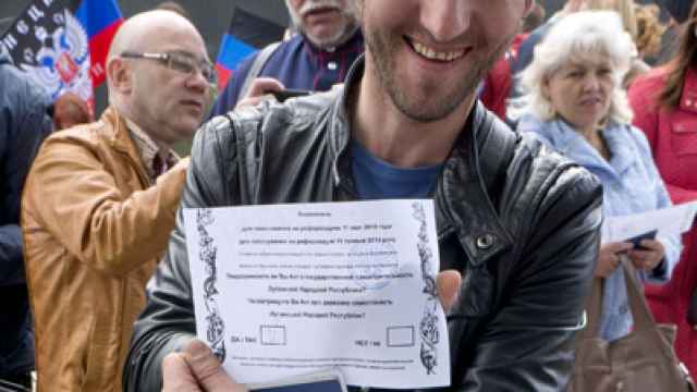 Central Moscow was engulfed in a sea of St. George's ribbons, Team-Russia apparel and Ukrainian passports Sunday morning as the self-proclaimed authorities of the Donetsk and Luhansk regions ran an improvised polling station for their referendums on independence.