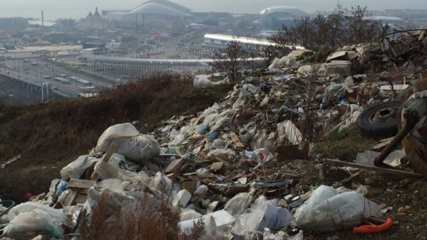 Trash covering a hillside in the village of Verkhneye Vesyoloye near Sochi. (Yekaterina Kravtsova for MT)