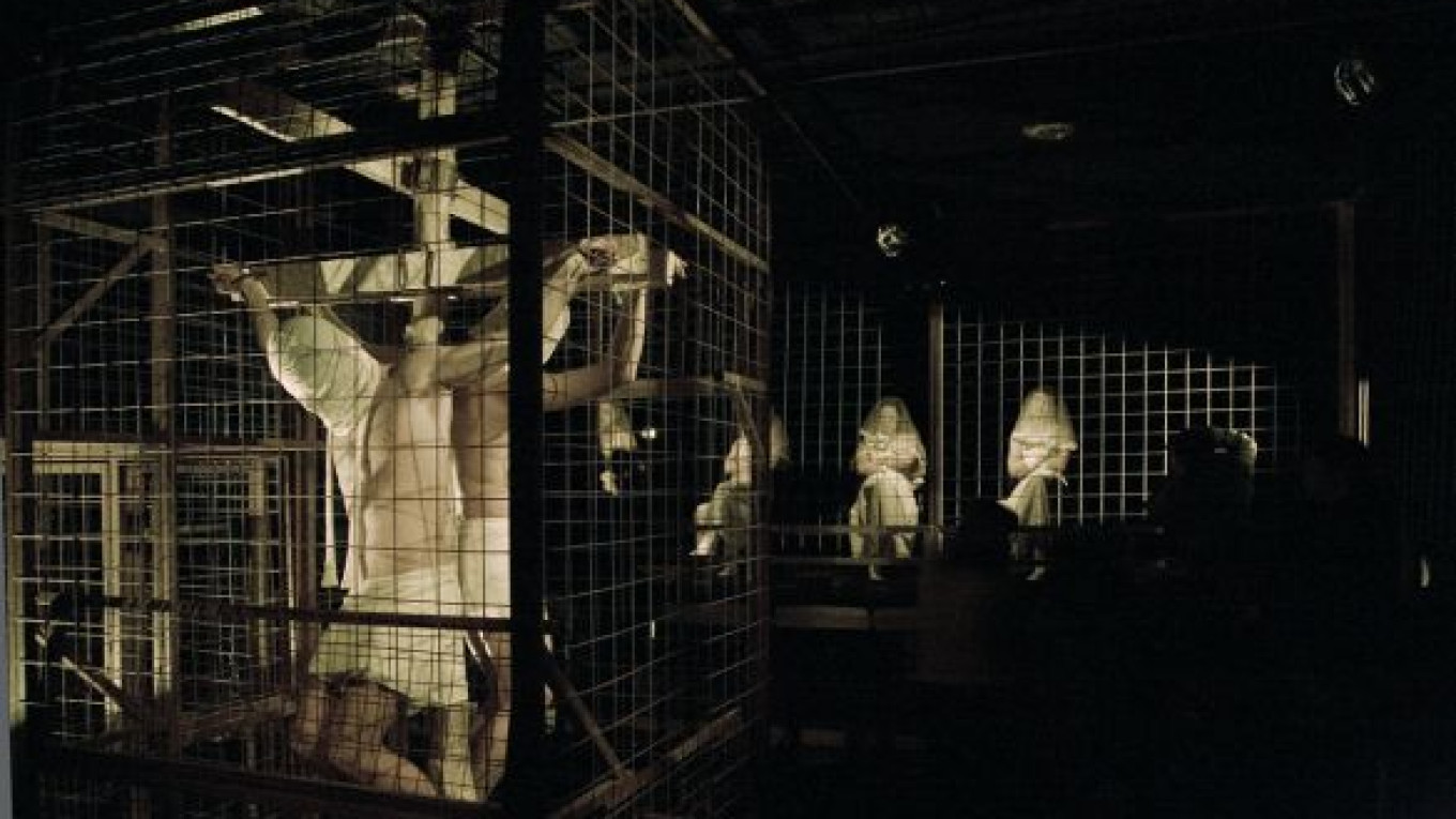 Much of this performance passes in silence. The setting up of the cage and the preparation of the actors as they take their places on the crosses form a remarkably long, wordless prologue — I calculated it at about 20 minutes. That’s in a show that barely lasts two hours.