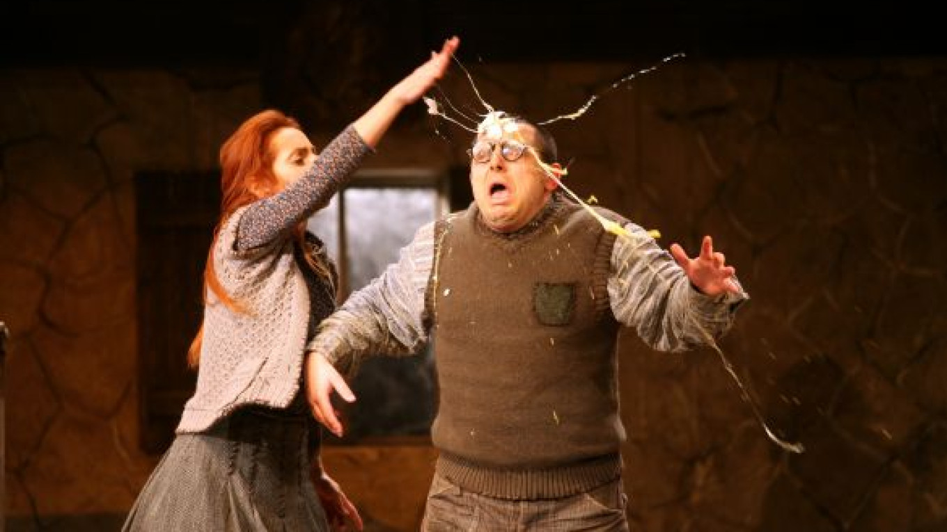 Vysotsky turns in a heroic and heartwarming performance as Billy. And Vysotskaya, as Helen, Billy's unlikely love interest, is a fireball of aggressive energy. When she unleashed an egg attack on her brother Bartley (Viktor Karpeko) at the show I attended, backing it up with cracking slaps up the backside of his head, the crowd at the Taganka gasped collectively from the sheer velocity and efficiency of it. Of all the cast, this pair probably approximates McDonagh's odd genre best.