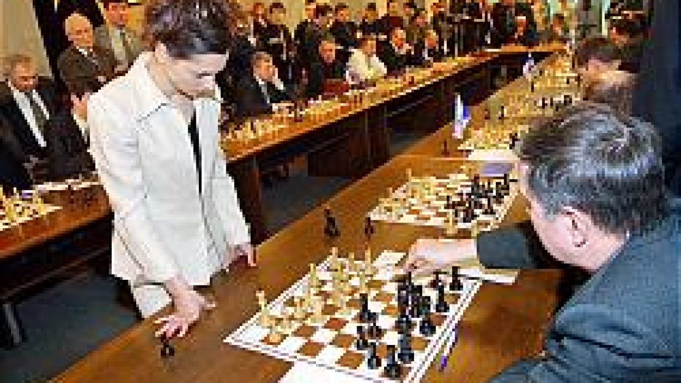 On a stairway in the State Duma, the world female vice chess champion recently staged a lightening attack on deputies and officials. Dressed in a cream-colored designer suit, Kostenyuk took on all comers, spending a few moments with each competitor before walking swiftly on -- starting by moving her pawn to G3 at each board.