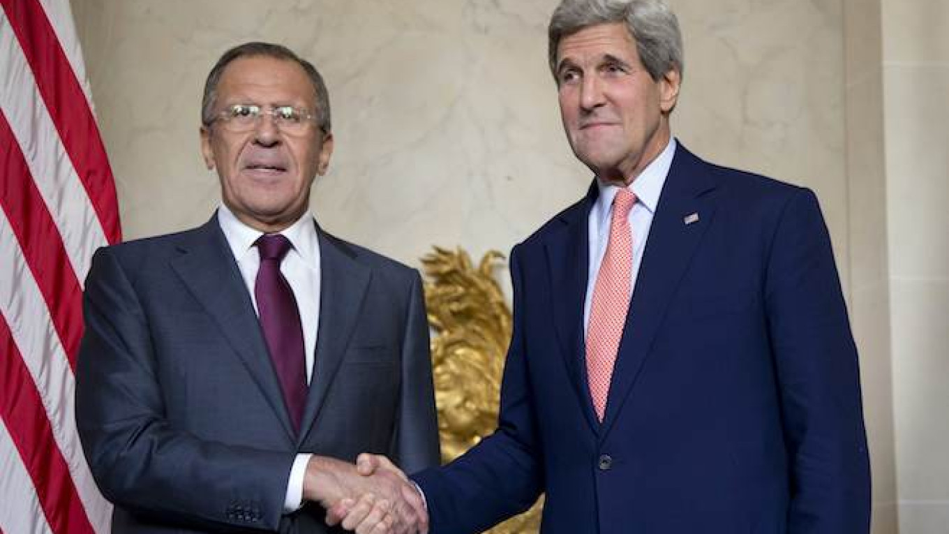 U.S. Secretary of State John Kerry (R) shakes hands with Russian Foreign Minister Sergei Lavrov at the Chief of Mission Residence in Paris Oct. 14, 2014. Carolyn Kaster / Reuters