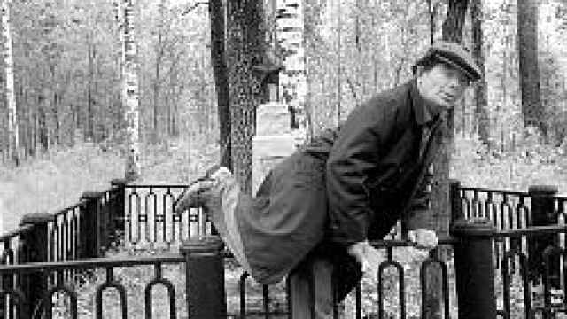 ![]() Yuri Kozyrev / LAT Innokenty Khlebnikov climbing over the railing of what is said to be the grave of Pavlik Morozov outside the village of Gerasimovka. | |