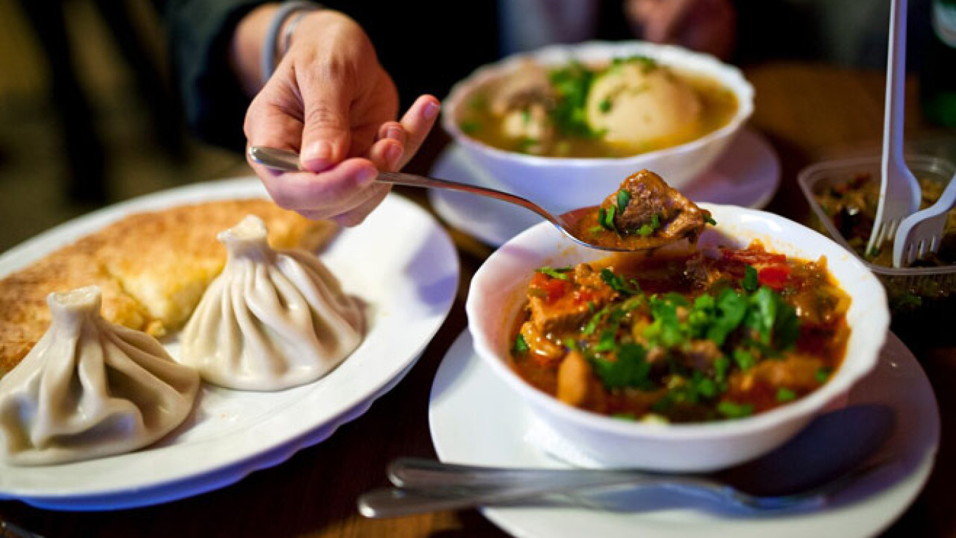 And it's cheap. The menu is glued onto the counter, with pictures of the food and prices scribbled in black marker. Just 230 rubles ($3.50) buys a feast: a steaming bowl of meaty red stew called chashushuli and fat stuffed cabbages slathered in sour cream and chopped chives. Half a crispy lavash costs 15 rubles, less than the price of a ketchup packet at KFC.