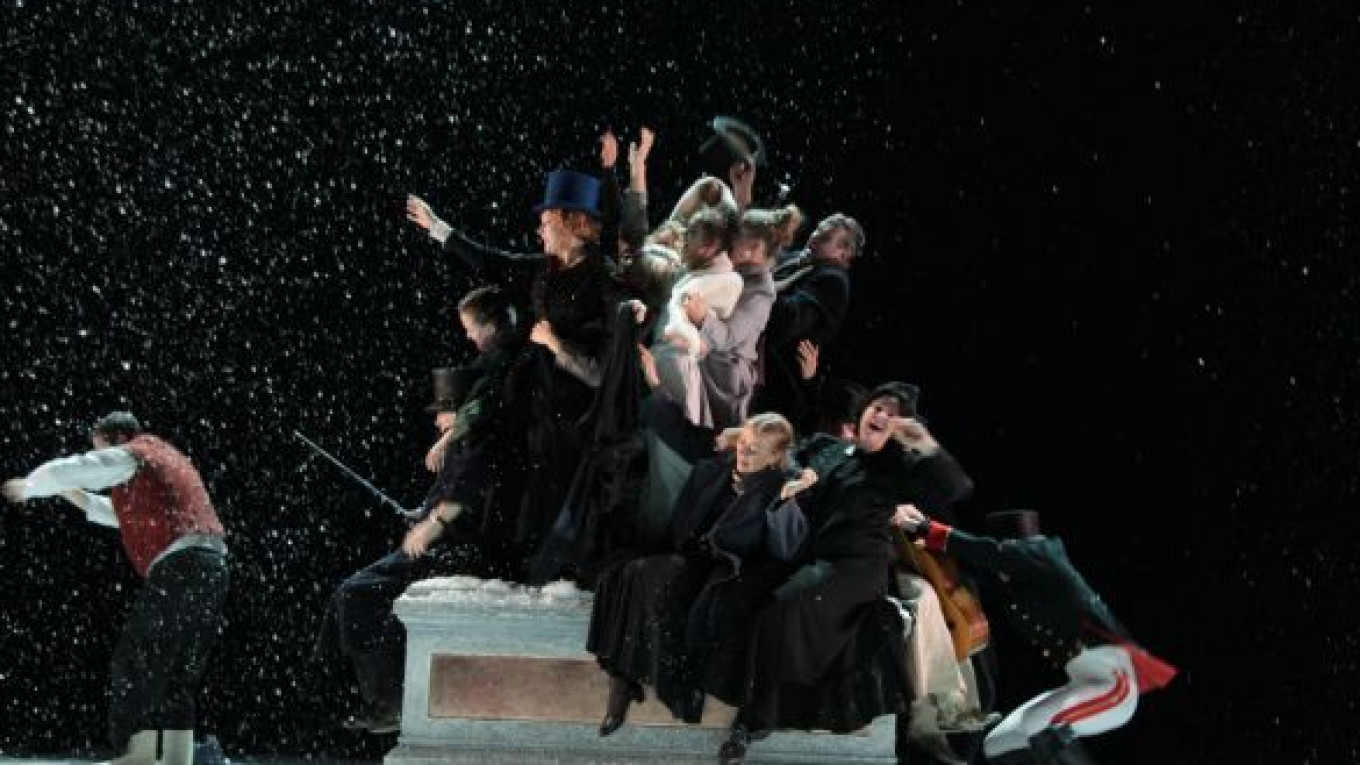 For the sense of vertigo you are likely to experience during the show, you can thank designer Adomas Jacovskis. His walls of falling snow at times make the stage at the Vakhtangov look like the inside of one of those toys of plastic-encapsulated snowstorms. It can be unsettling, and it is utterly gorgeous.