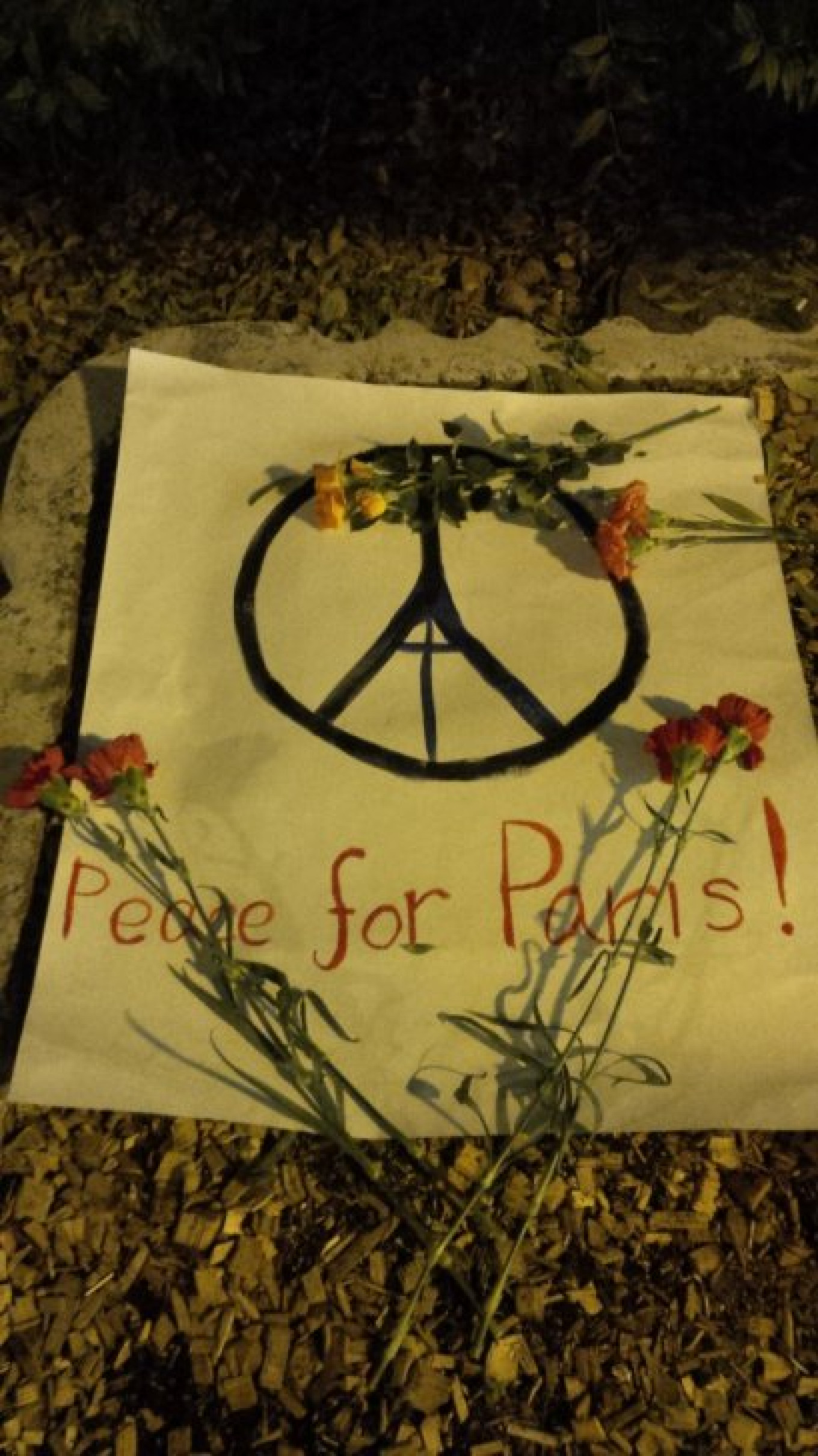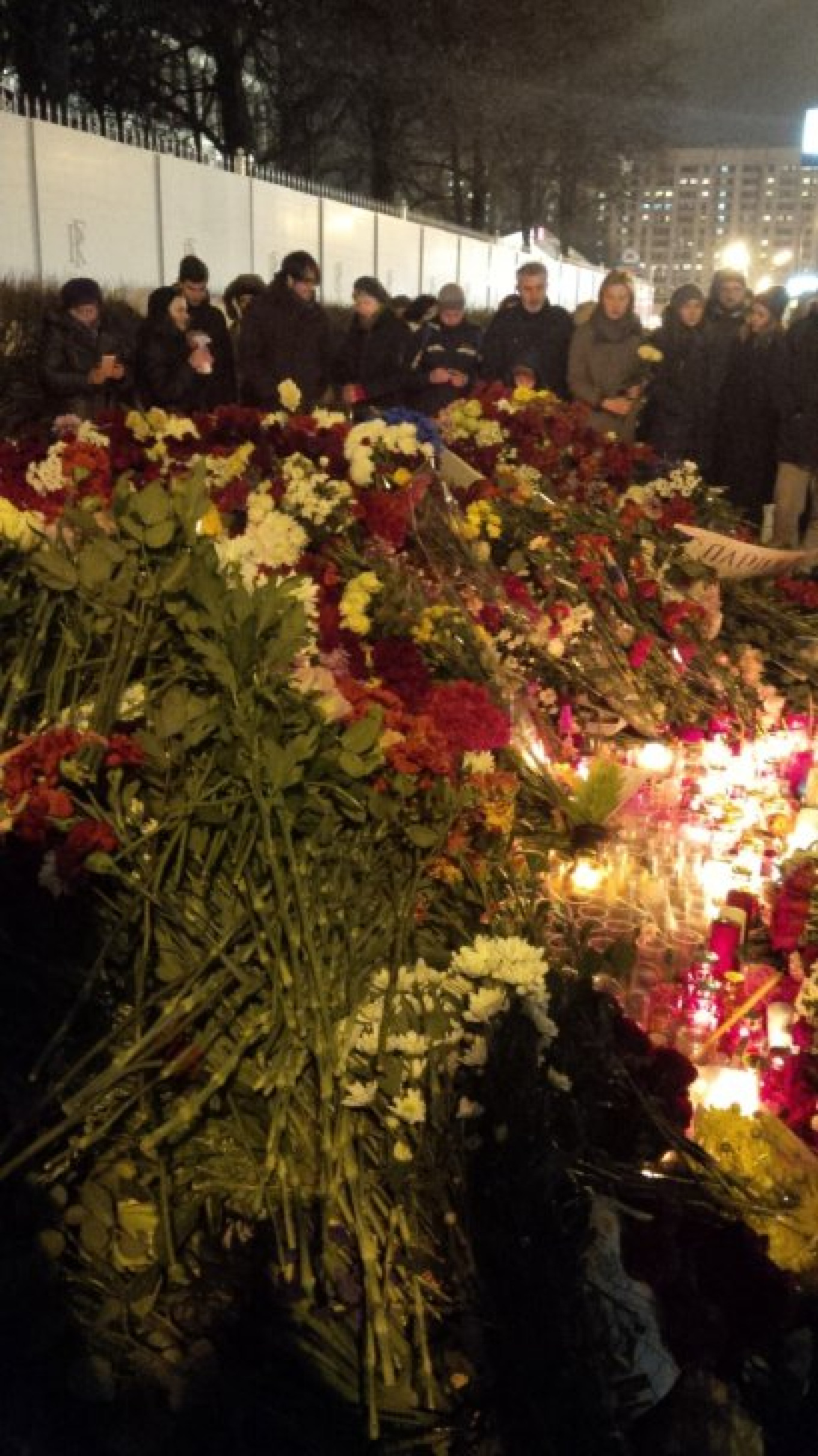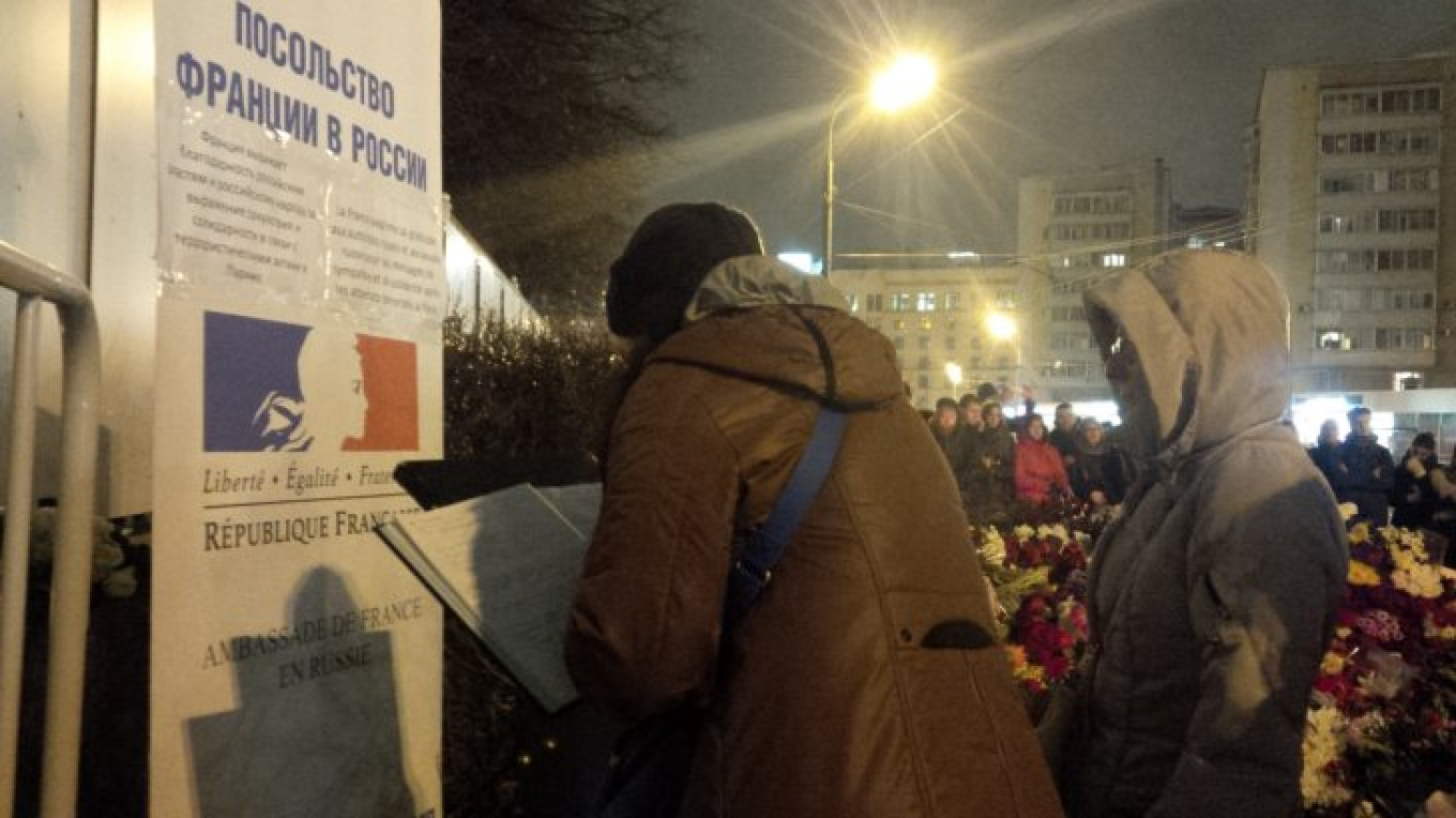 Muscovites gathered outside the French Embassy to extend condolences over the terrorist attacks in Paris on Friday. Flowers, candles and icons were brought to the embassy from midnight, Friday night. Signs in Russian, English and French express support and solidarity: "Je Suis Paris," "Pray for France," and "Stop the War."?