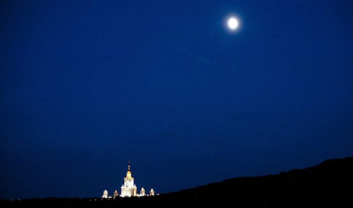 The moon shining over Moscow State University.
