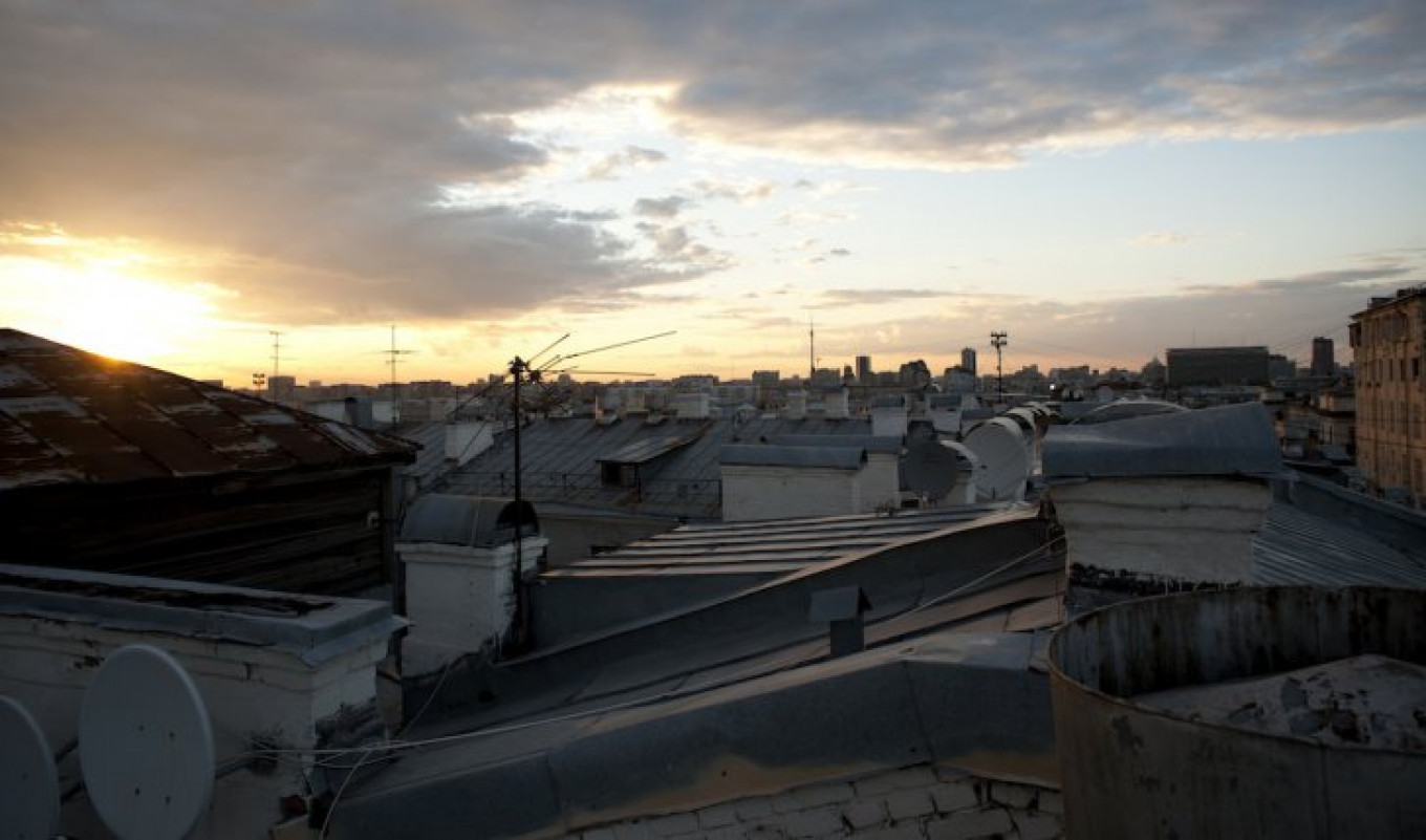 The sun rising over Moscow's rooftops.