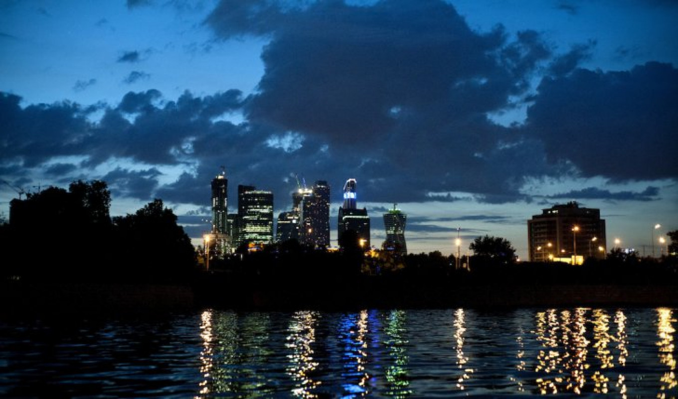 The Moscow City business district reflected in the Moscow River.