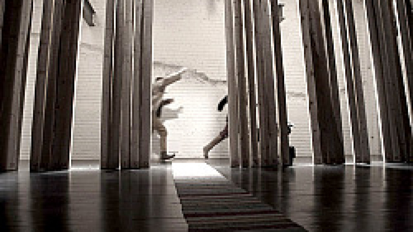 Designer Alexander Borovsky kept his contribution to a bare minimum, allowing the simplicity and atmosphere of the small, brick-walled room seating 40 spectators to speak for itself. Audience members sit on wooden stools around three of the four walls. Enormous, rough-cut wooden planks lean against a high catwalk along the fourth wall.