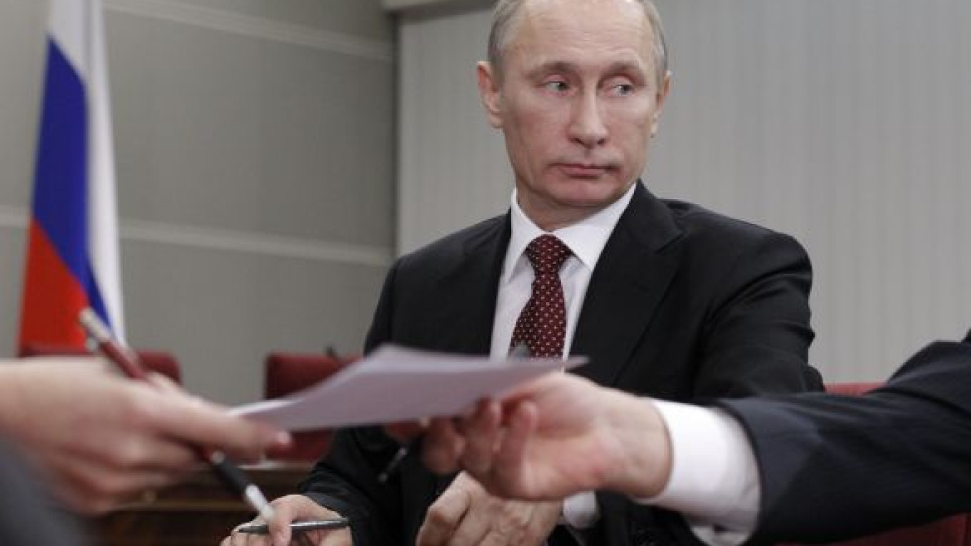 Helicopters patrolled the skies above Moscow on Wednesday as Prime Minister Vladimir Putin marched into the Central Elections Commission to file paperwork declaring himself a candidate for president.