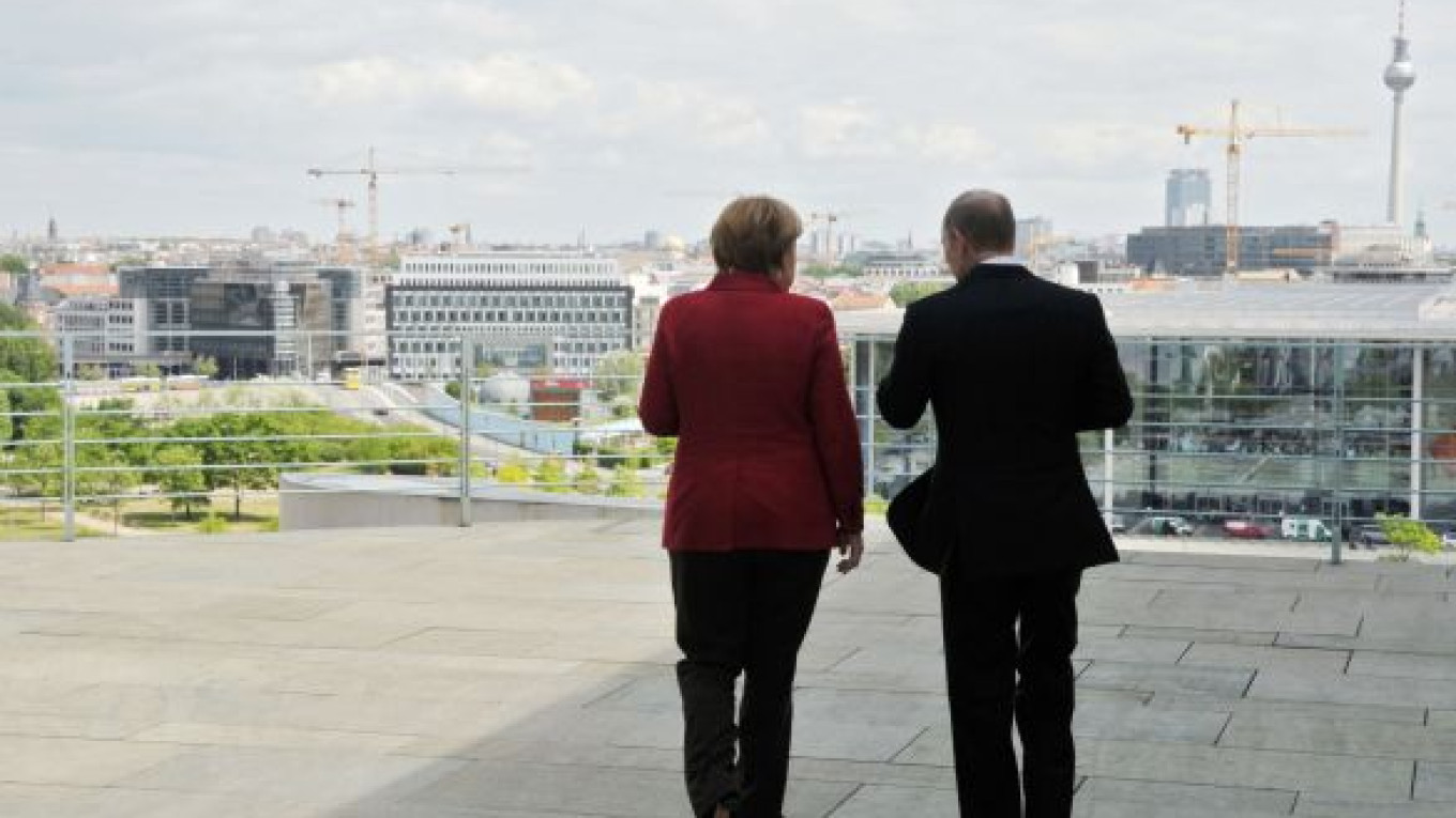 Chancellor Angela Merkel and President Vladimir Putin walking on the roof of the Chancellery in Berlin on Friday. Alexei Nikolsky