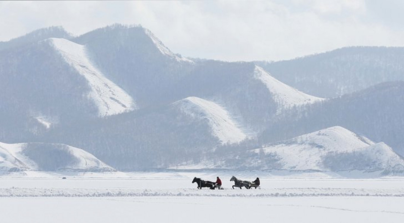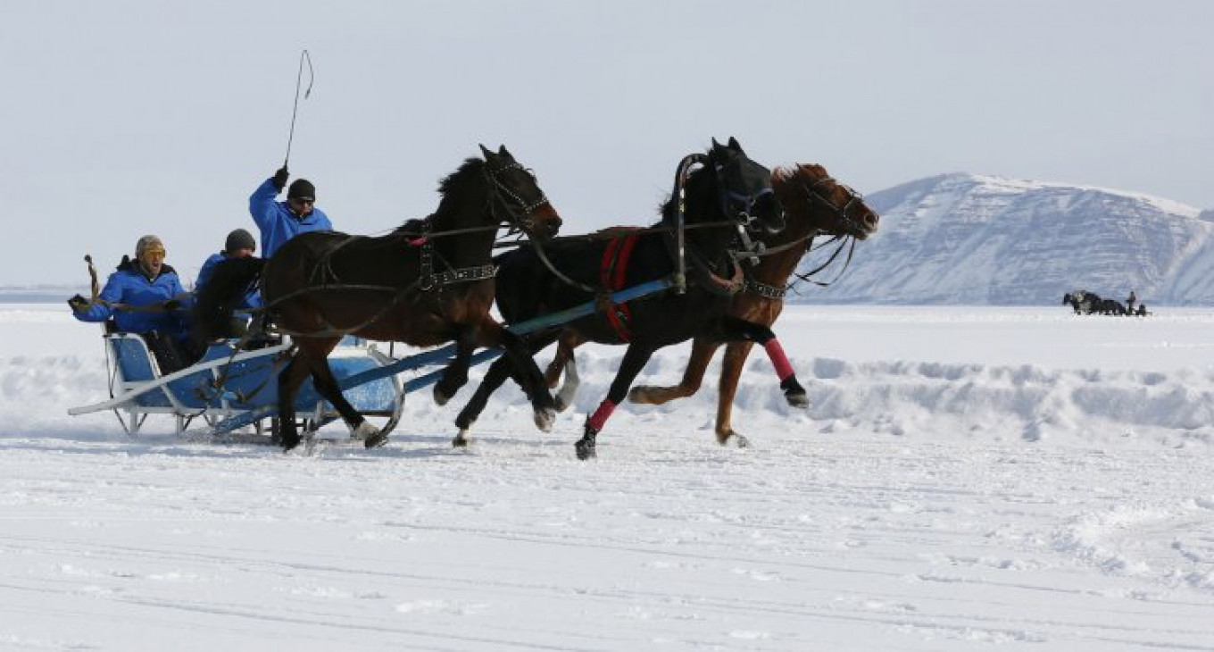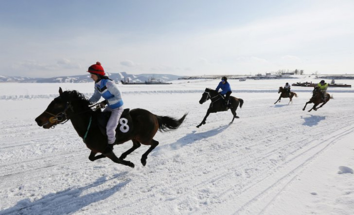 Trotters compete in a harness race on the frozen Yenisei River.