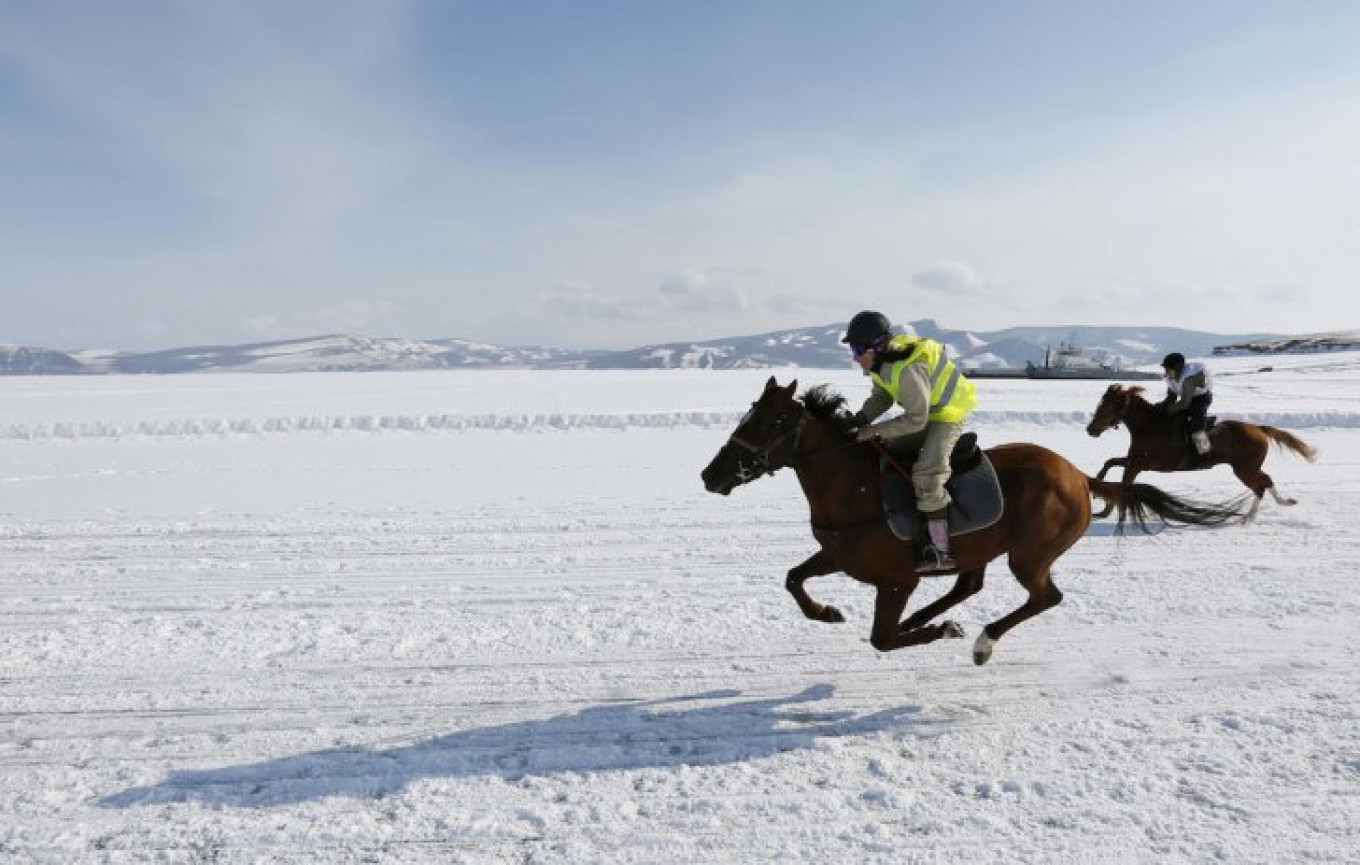Riders compete on the frozen Yenisei River during the 45th Ice Derby amateur horse race near the settlement of Novosyolovo, south of the Siberian city of Krasnoyarsk, March 14, 2015.