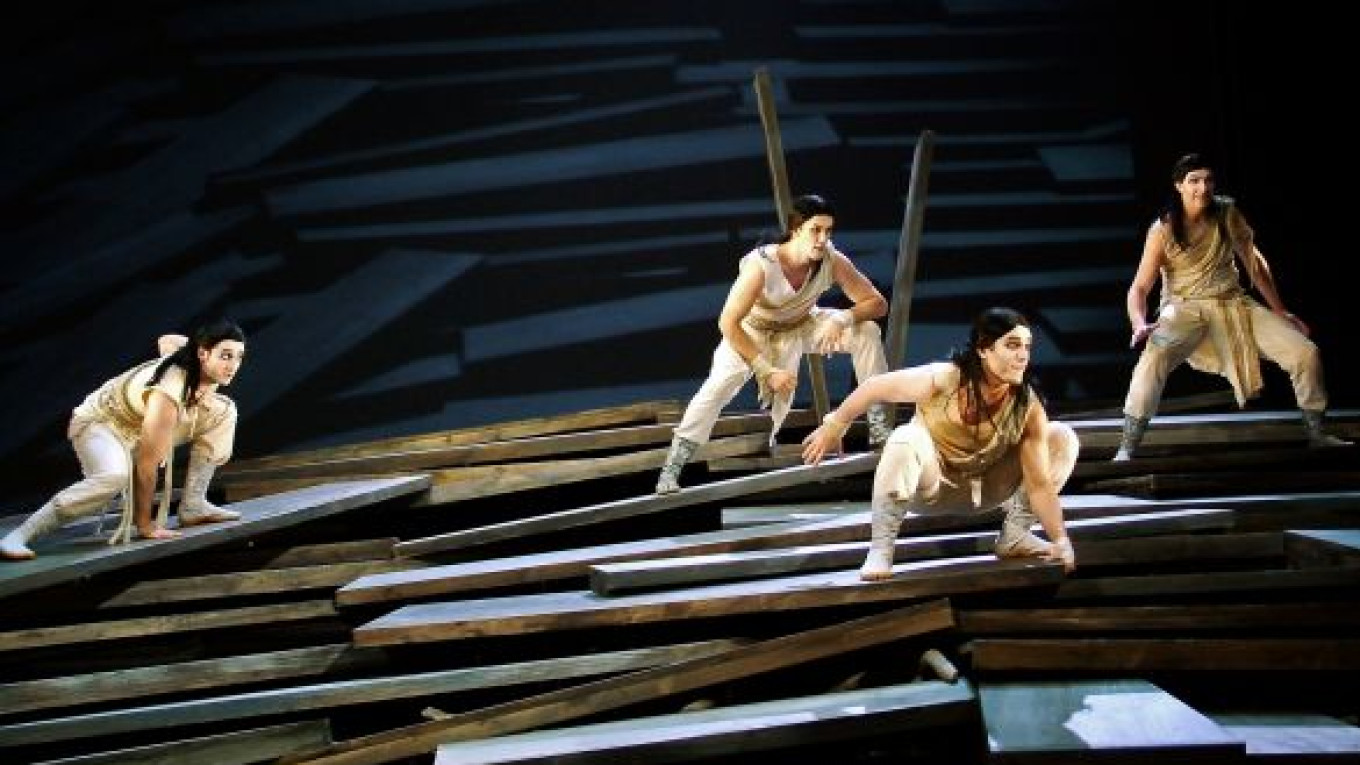 Designer Marina Filatova provided the stylized set of a mountain constructed from wooden planks and backed by a screen that “moves” the action to various locations — such as a forest or an interior — with video images created by Florian Alberge.