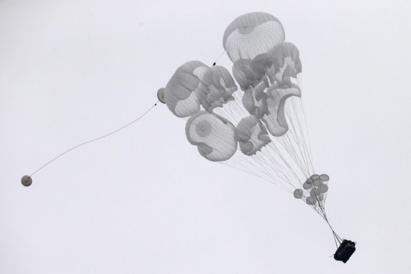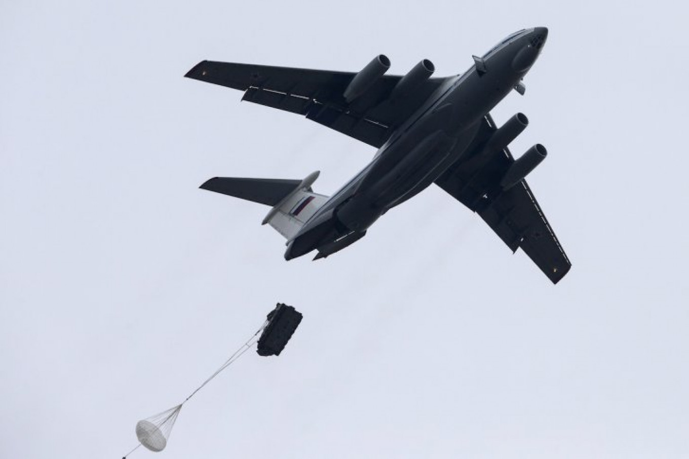 A Russian IL-76 transport aircraft drops a BMD armored personnel carrier during a training exercise in the village of Nikinci, west from Belgrade.