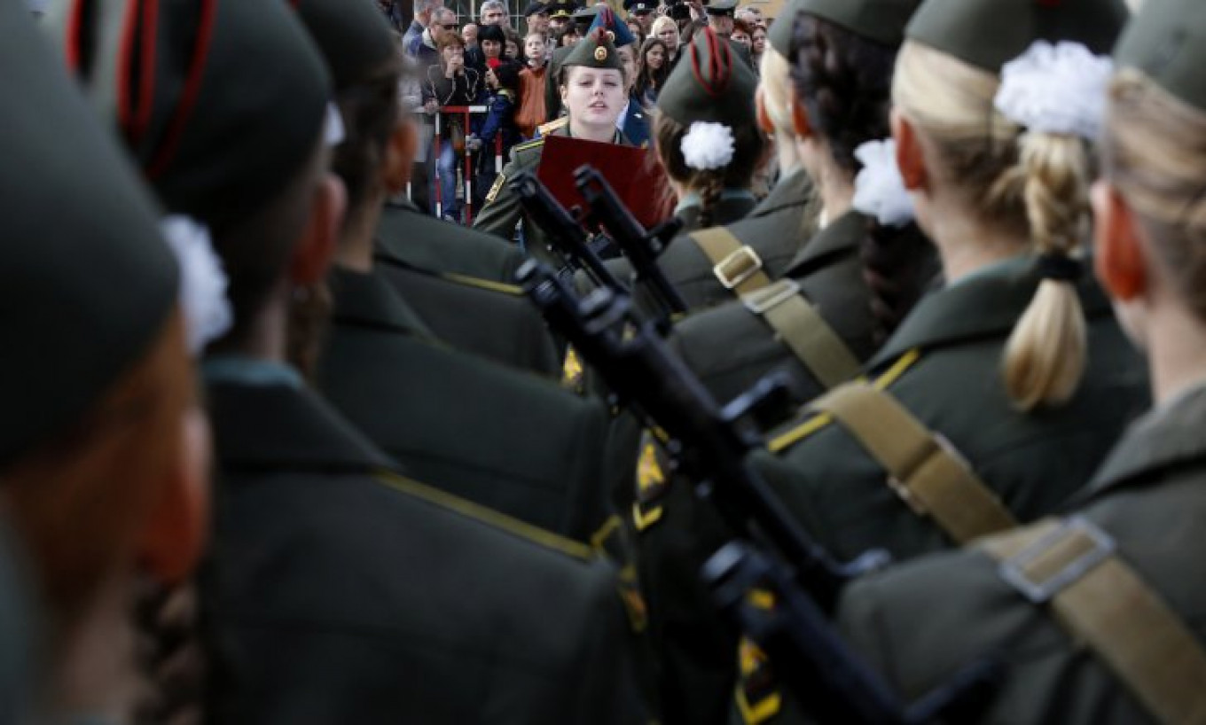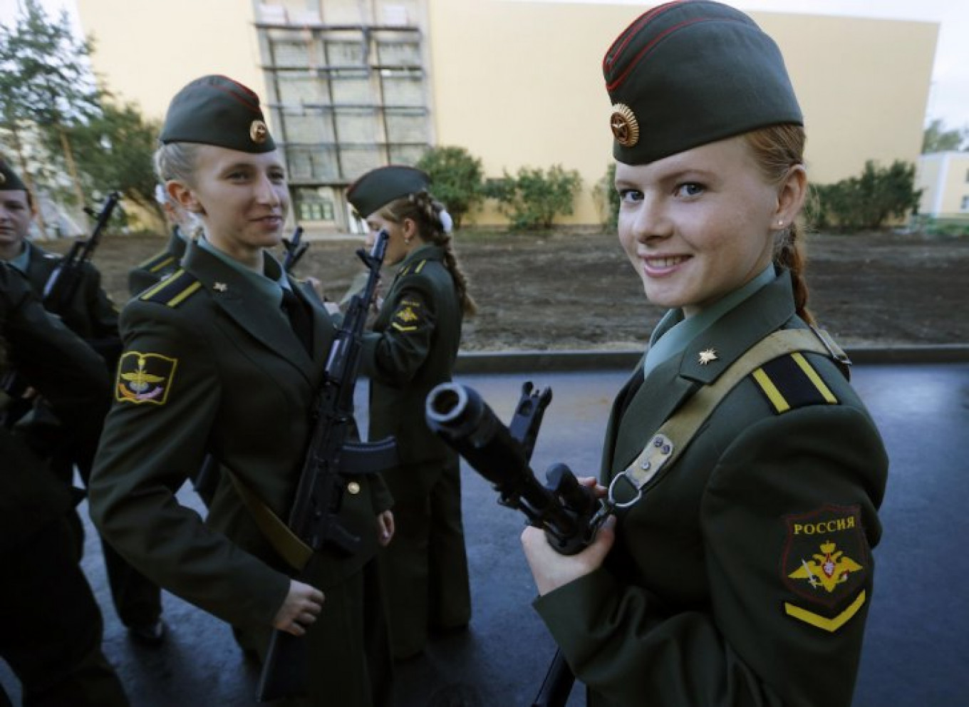 First year cadets of the Military University of Communication smile before an oath-taking ceremony in St.Petersburg.