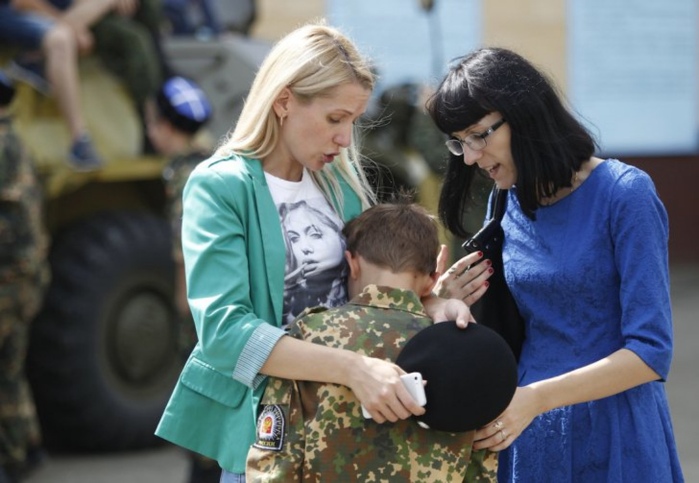Women comfort a first-year student from the General Yermolov Cadet School during his oath taking ceremony in the southern Russian city of Stavropol.