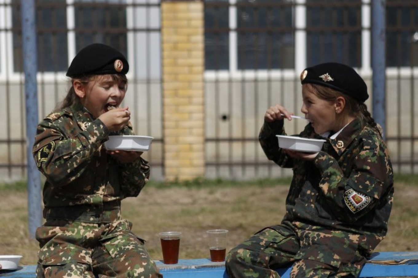 First-year students from the General Yermolov Cadet School eat during the oath taking ceremony in the southern Russian city of Stavropol.