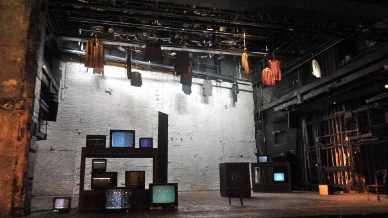 Peretrukhina's design is subtle and meaningful. She used elements from several famous old Taganka productions, spreading 11 television monitors around the stage. Most of the time they showed nothing but static, but for brief seconds images of famous Taganka actors would come into focus and then disappear into static again.