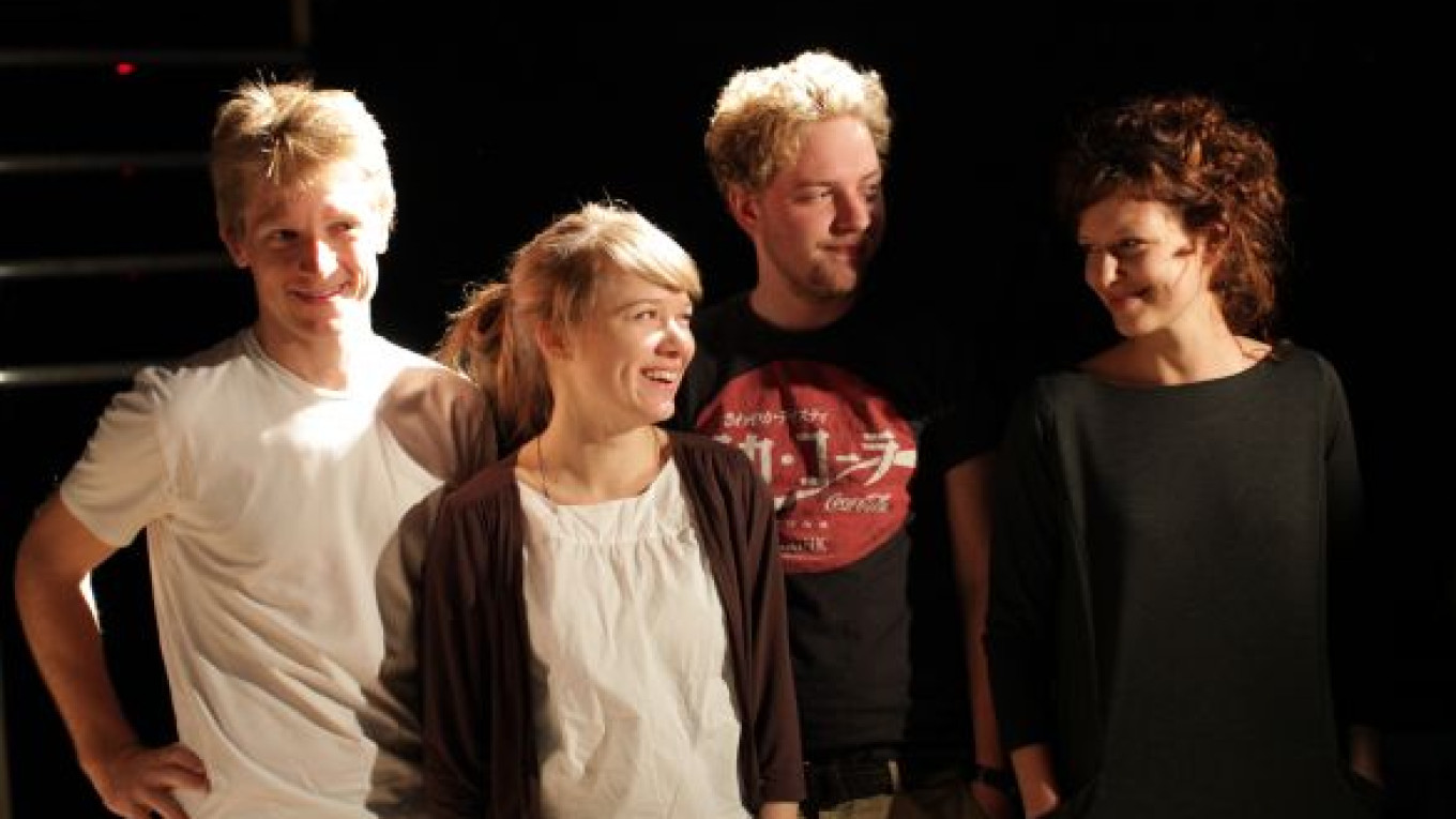 The microphone is a crucial theatrical tool. It is set to pick up the most insignificant of sounds. Strictly speaking, there is no need for a microphone in the tiny Praktika hall. Anyone’s unamplified voice can easily be heard in the tenth and final row of seats. But Vyrypayev, who both wrote the play and directed, wanted his actors to sound as if they are whispering in our ears. Speaking into the sensitive mic, their every sound, breath, and swallow — even the dryness of their mouths — is registered audibly in the hall. Each actor employs personal rhythms, mimicry and intonations to tell bits and pieces of the interlocking stories of four people who loved each other in reality or in their imagination.