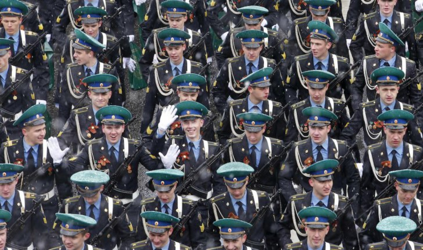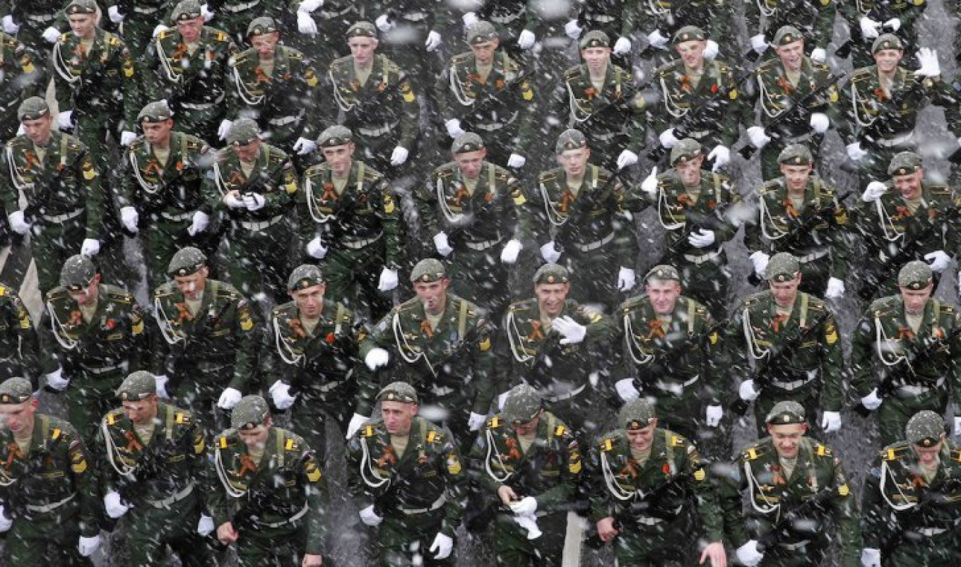 Russian servicemen walk in formation as they take part in a rehearsal for the Victory Day military parade during a snowfall in central Moscow, May 7, 2014. Russia celebrates victory over Nazi Germany on May 9.