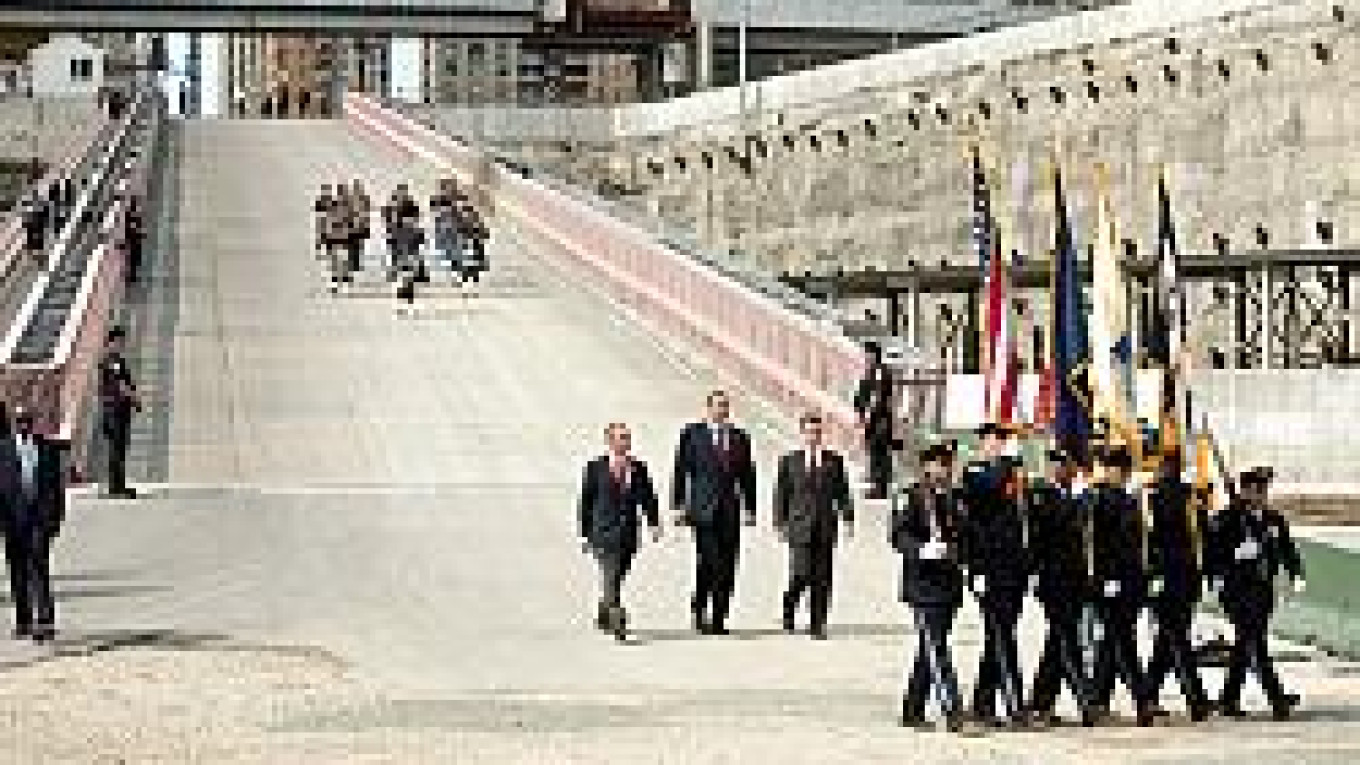 New Jersey Governor James McGreevey said: "We reclaim this ground in the names of those who we have lost." The 13-year-old son of a police officer killed on Sept. 11 read portions of the U.S. Declaration of Independence.